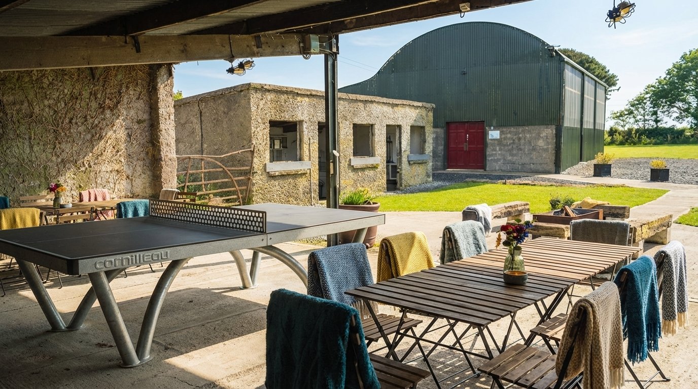 The Dunamase Barn is ideal for intimate gatherings, accommodating up to 20 guests with long tables. This communal space includes a table tennis area, a BBQ area, and a fire pit that can host up to 10 people, creating a warm and inviting atmosphere for your celebration. Note that if only one property is booked, the barn is shared with other guests.
