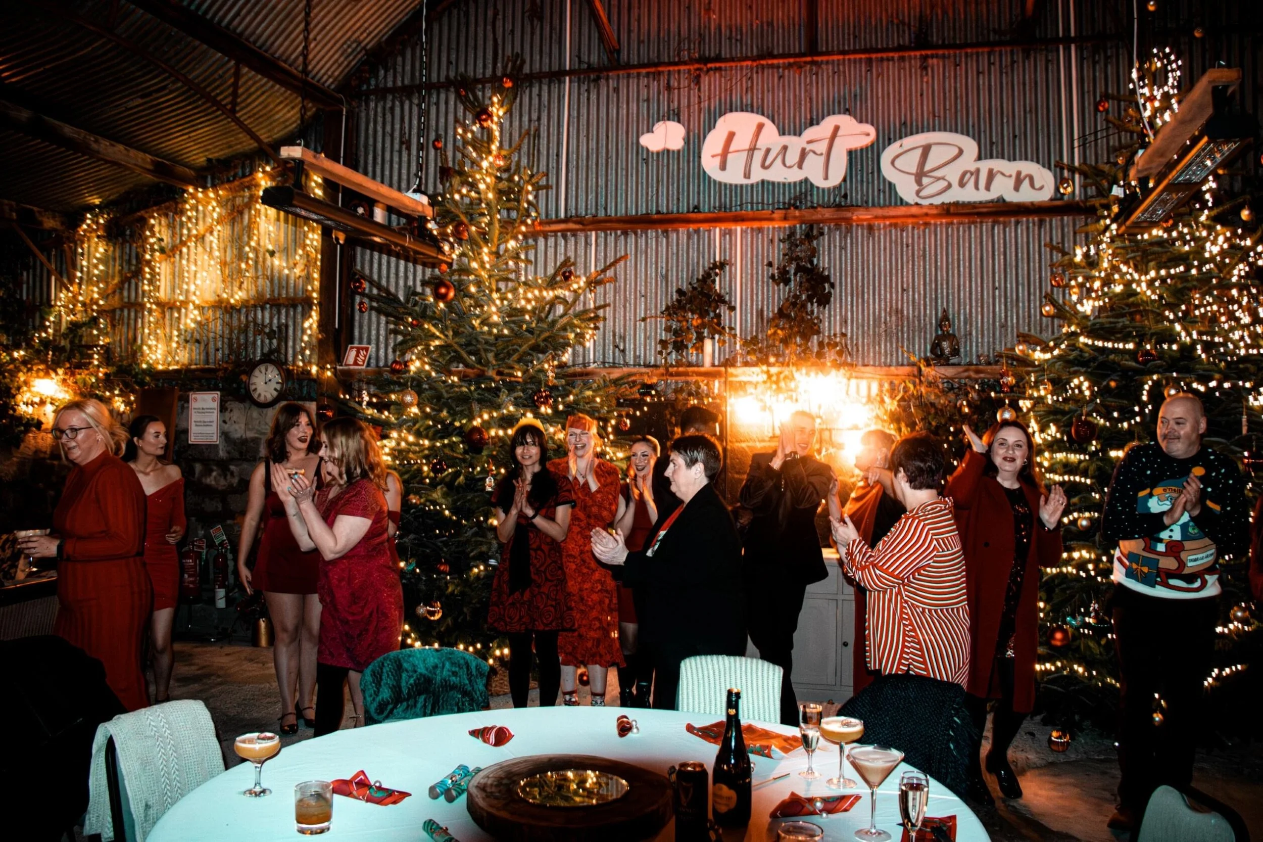 The Sir Hurt Barn is an exclusive venue available only with the rental of the Main House or when both properties are booked together. It accommodates 30 to 50 guests using 3 to 5 six-foot round tables and features a sound system, unmanned bar, heaters, drinks fridge, and a cozy lounge cinema area.